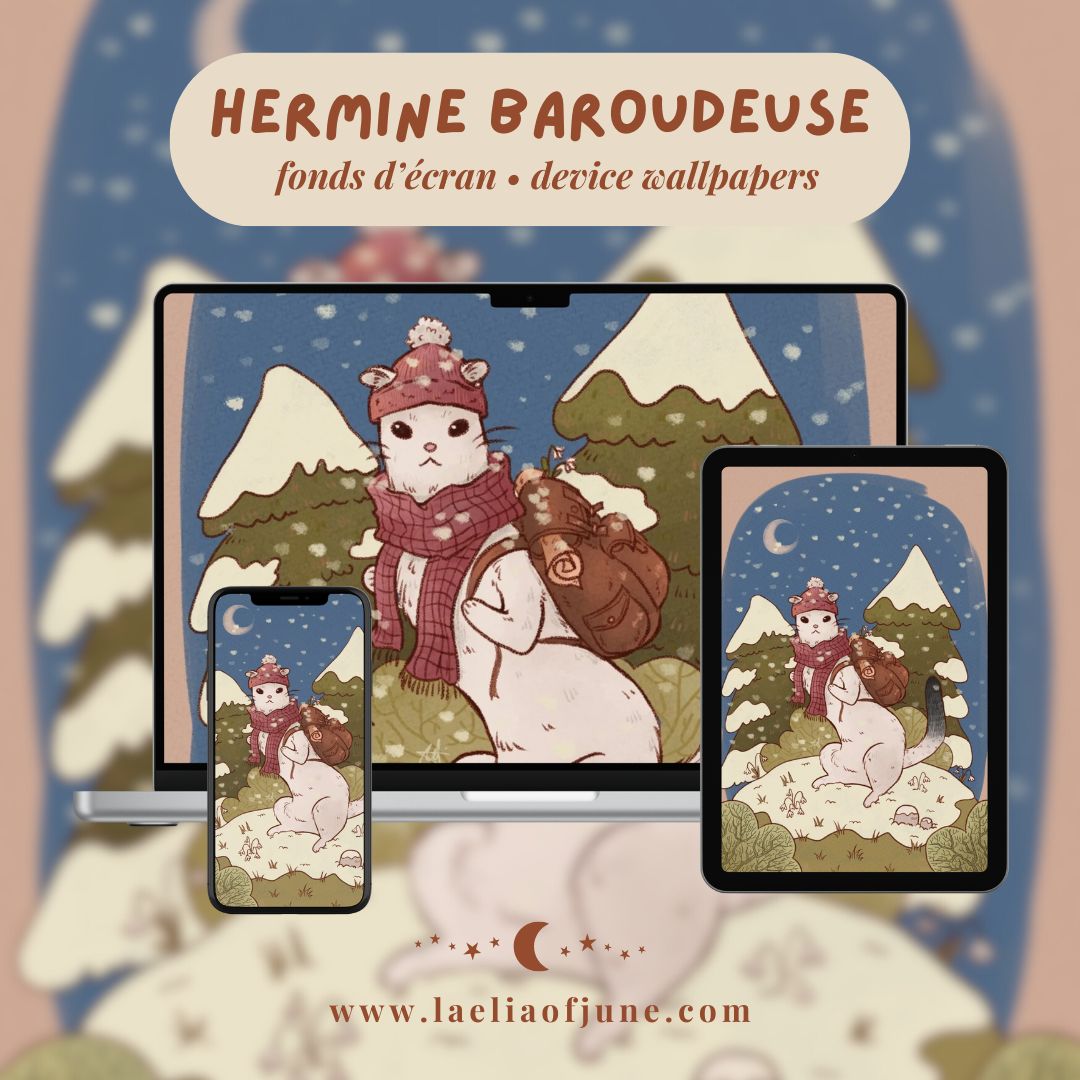 Ambiance cozy et hivernale avec ce set de fonds d'écran tirés de ma dernière illustration, la petite hermine baroudeuse.