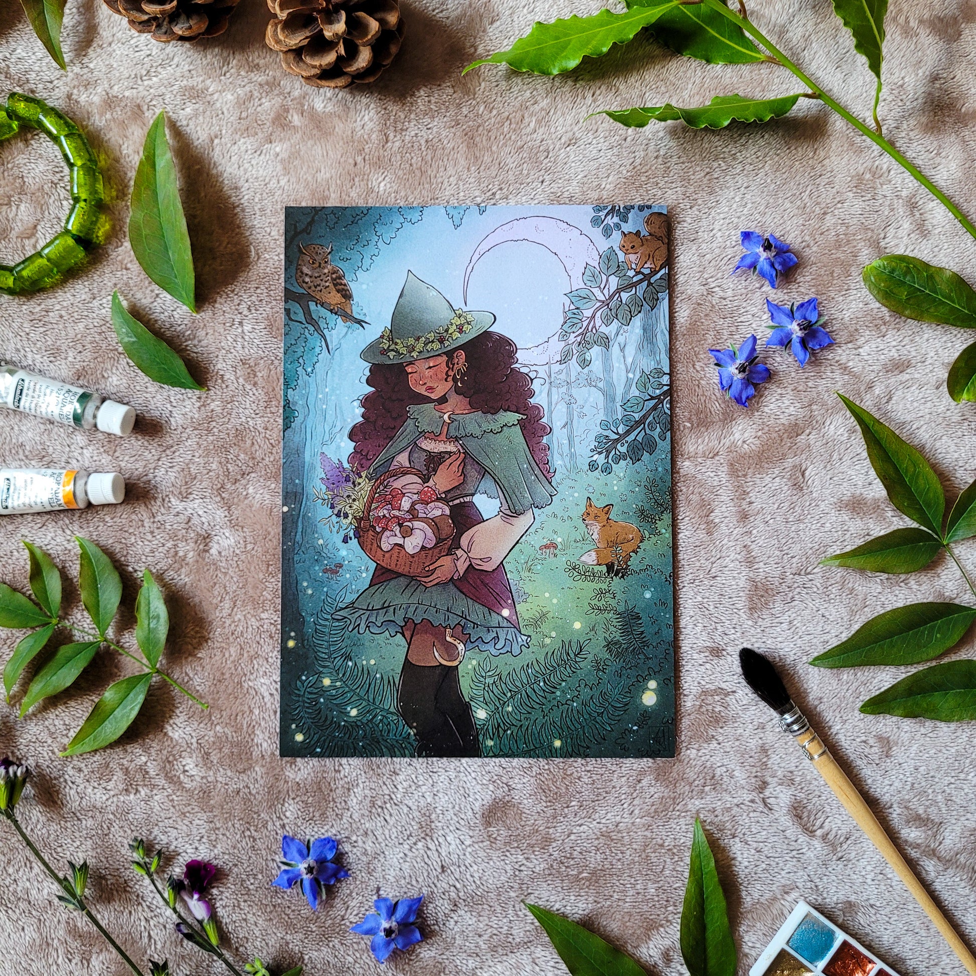 Sous les rayons de la lune, la sorcière parcourt les bois à la recherche d’ingrédients magiques 🌙